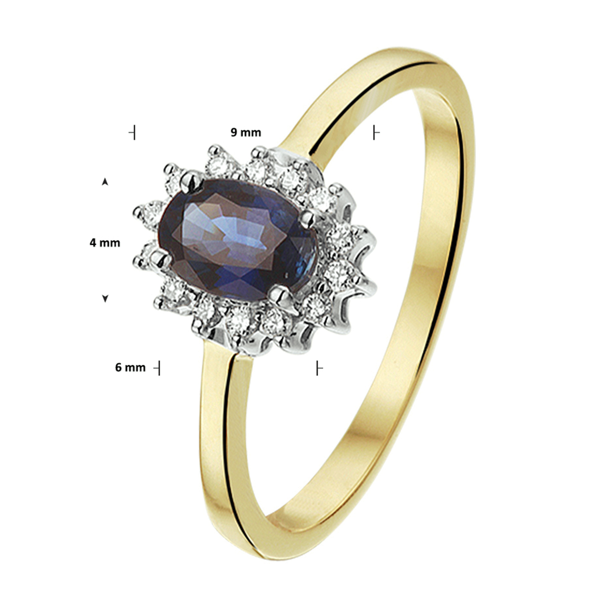 Chique bicolor geel en witgouden ring uitgevoerd met een saffier van 6x4mm en een luxe rozet van briljant geslepen diamant 0.10ct H SI. Deze elegante ring geeft uw outfit op een subtiele wijze een elegante uitstraling. Tip: Leuk om kado te geven. Diamonds are girls best friend!