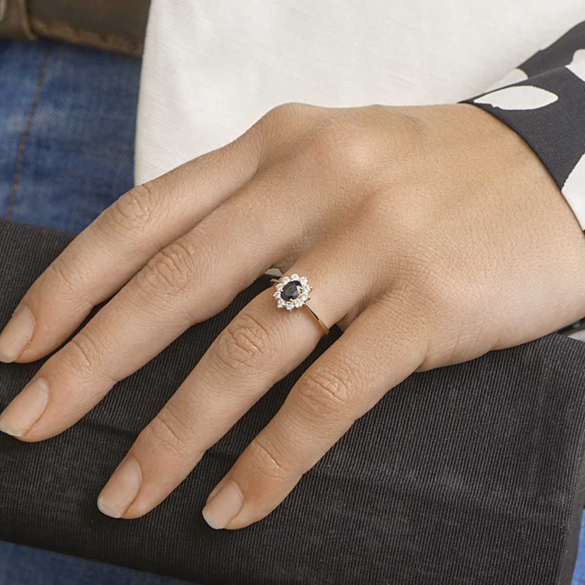 Beschrijving: Geelgouden ring met een rozet van saffier en zirkonia.