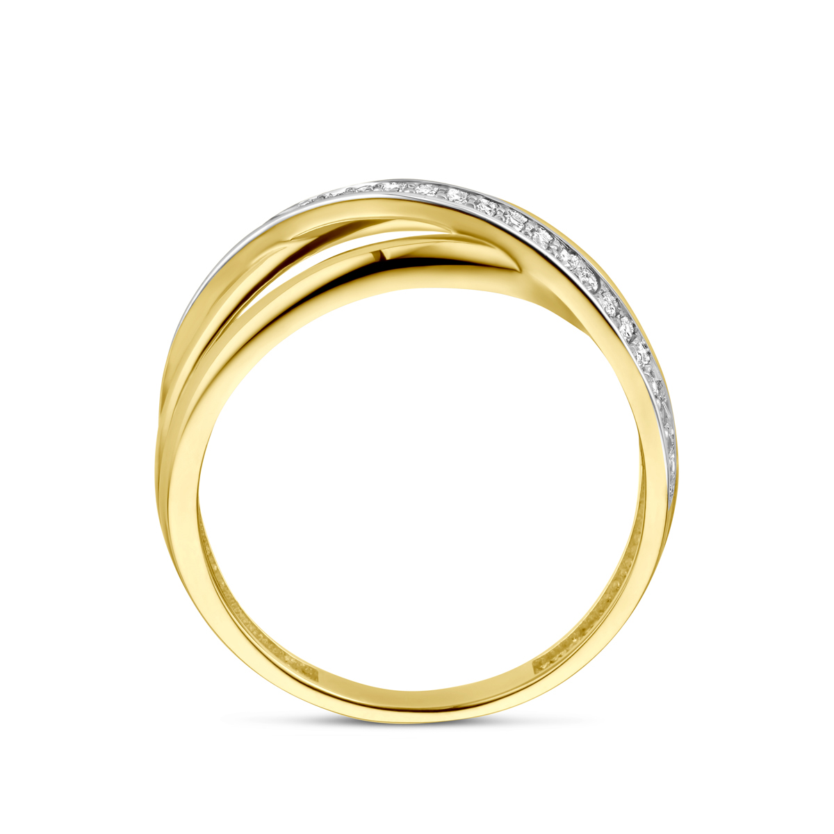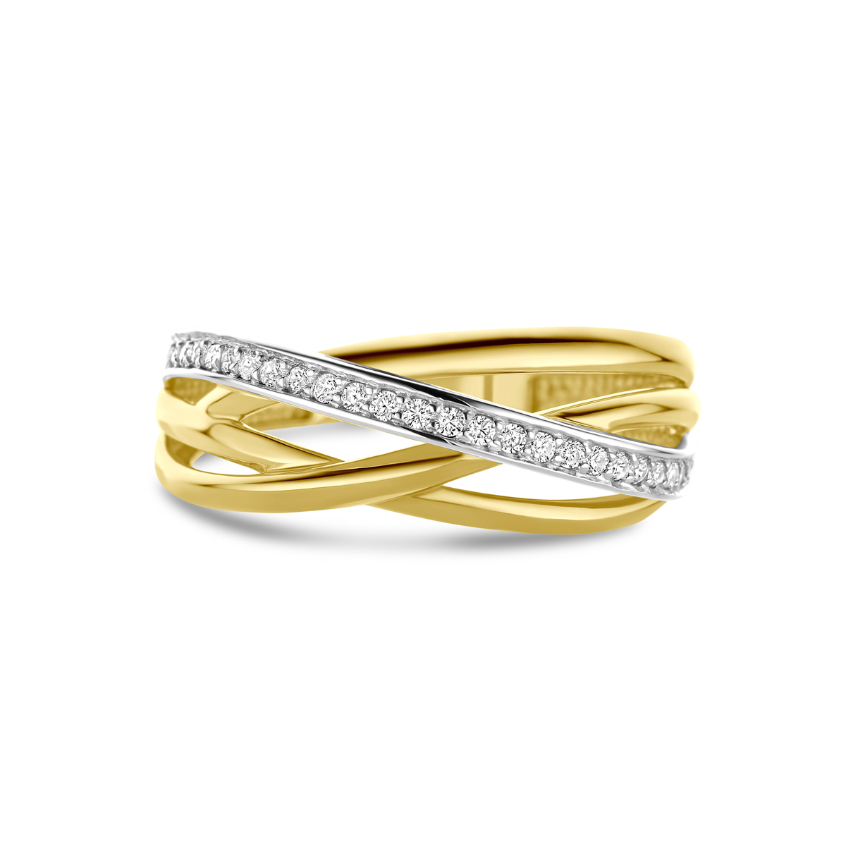 Chique geel met witgoud gestifte ring met een breedte van 8mm uitgevoerd met een luxe rijzetting van briljant gesplepen zirkonia.Tip: Combineer deze ring met sieraden uit onze collectie of vanuit je eigen stash en creeer zo elke keer weer een nieuwe look!.