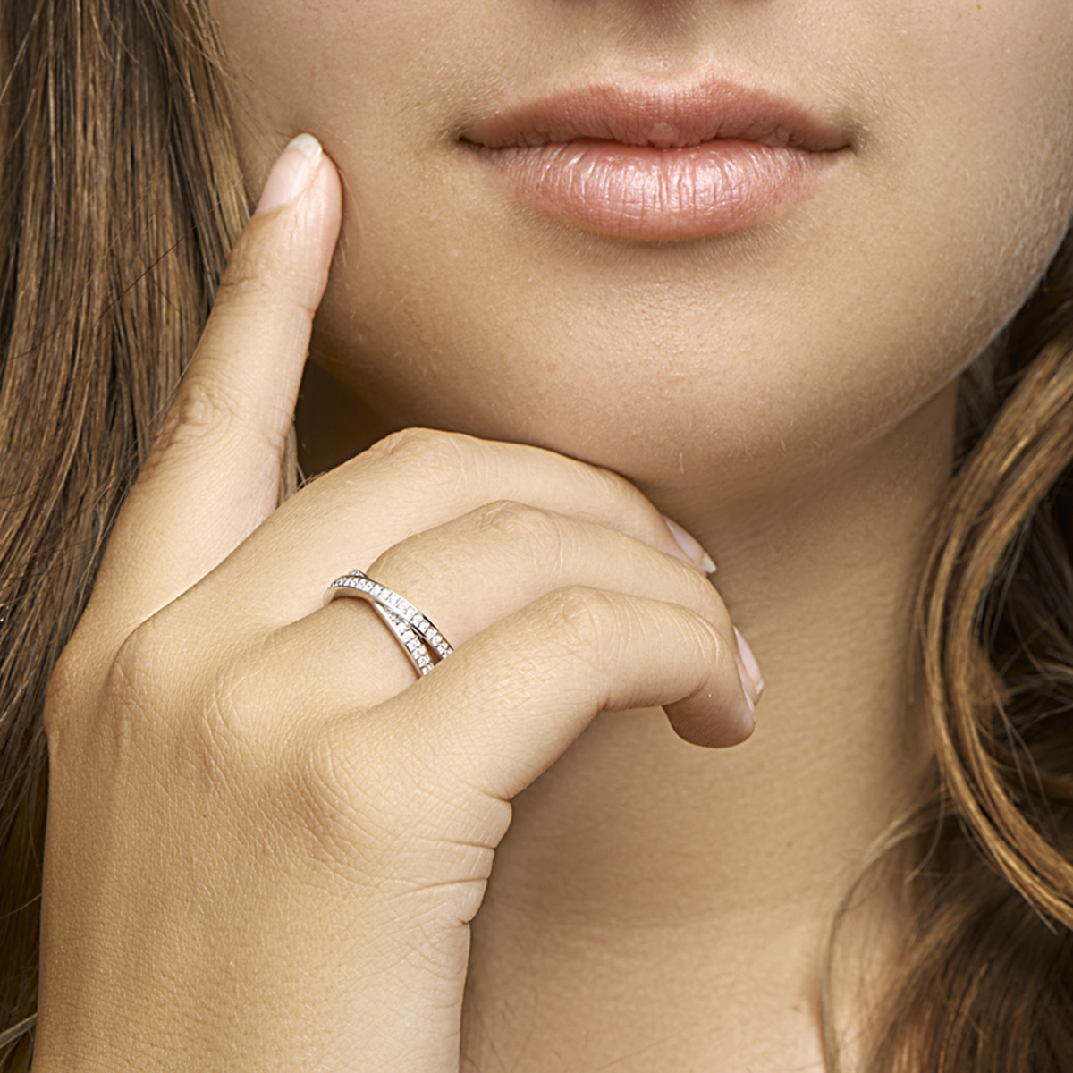 Beschrijving: Gerhodineerd zilveren ring uitgevoerd met een rij van heldere zirkonia. Info: Gerhodineerd zilver is door de rhodiumlaag beter bestand tegen verkleuren en krassen.