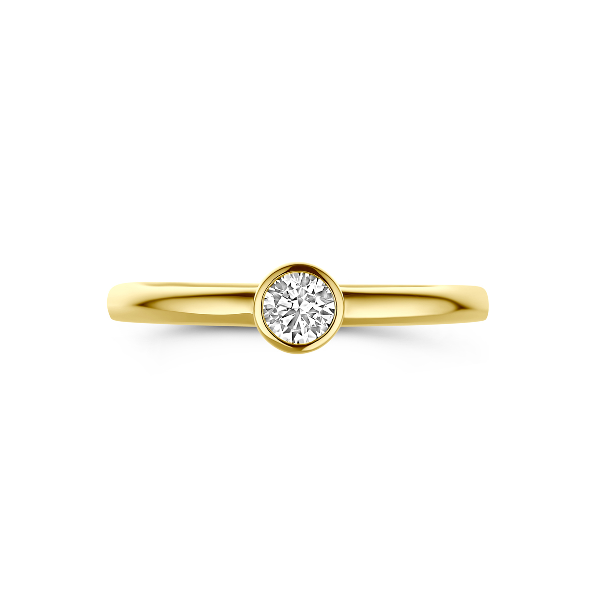 Schitterende geelgouden ring uitgevoerd met een heldere zirkonia van 4mm. Draag deze ring apart of naast uw andere ringen en creeer zo elke keer weer een nieuwe look.