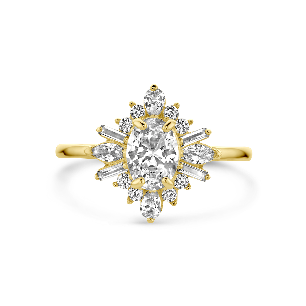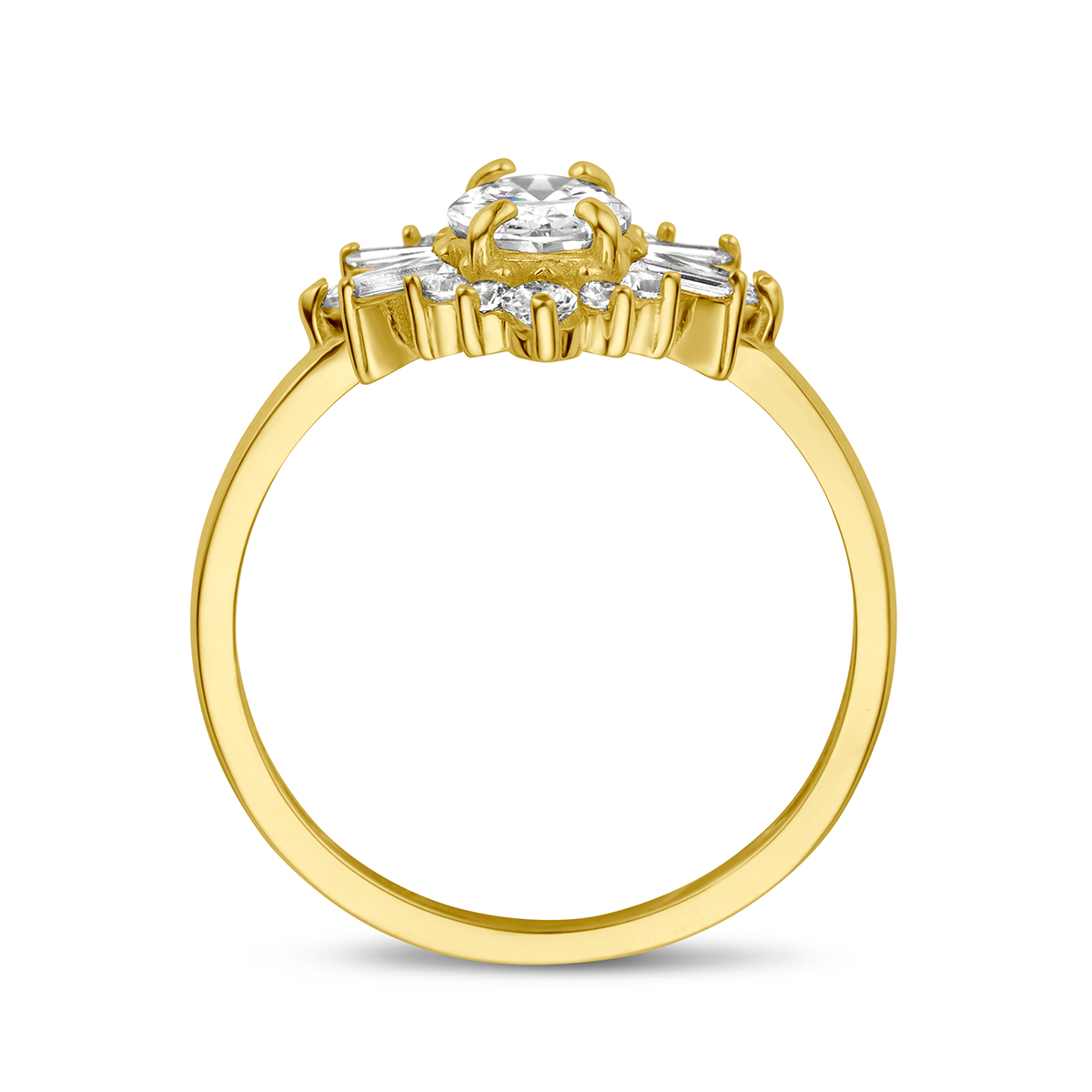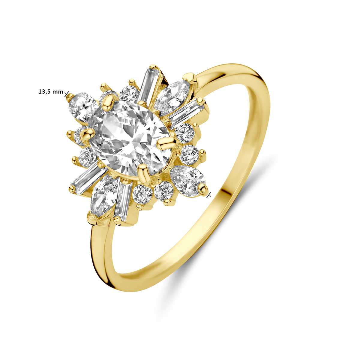 14k Geelgouden ring uitgevoerd met zirkonia. De ring heeft een breedte van 13.5mm.