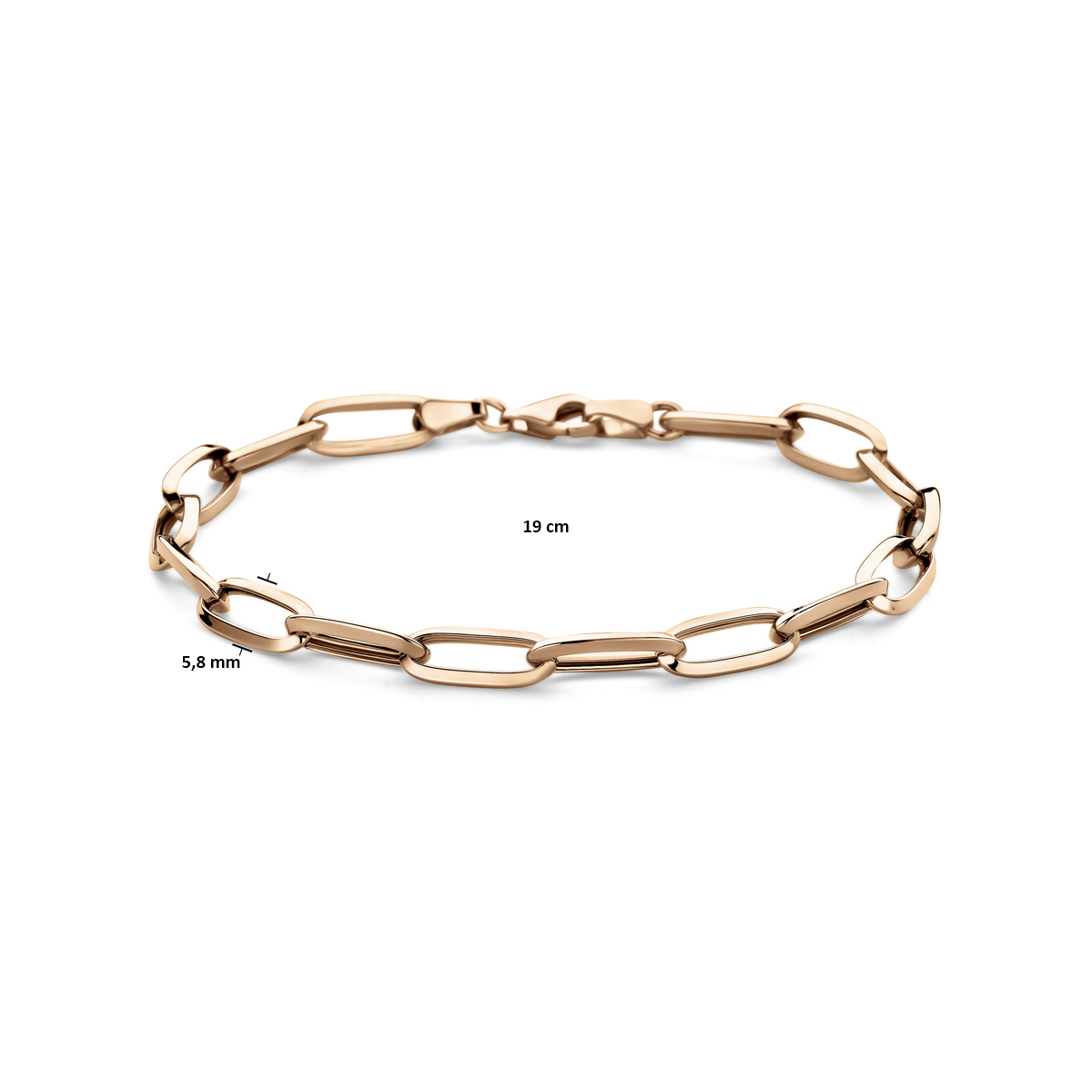 14k Roségouden armband met een schakelbreedte van 5.8mm. De armband is uitgevoerd met een karabijn sluiting en heeft een draaglengte van 19cm.