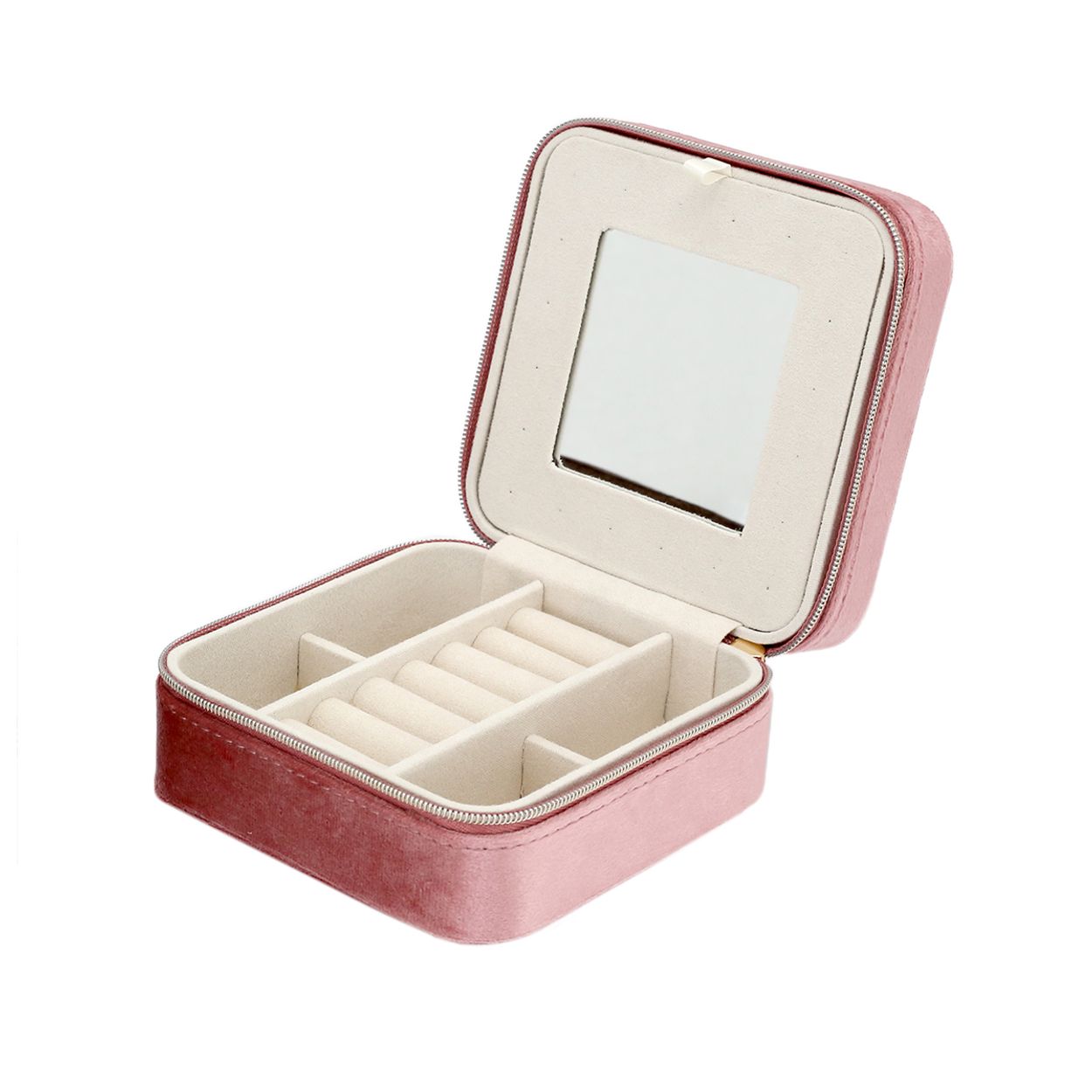 Luxe sieradenbox in de kleur roze uitgevoerd met een goudkleurige rits sluiting, een klein spiegeltje, verschillende vakjes en een extra vakje achter het spiegeltje. Een compacte box om verschillende sieraden in op te bergen.