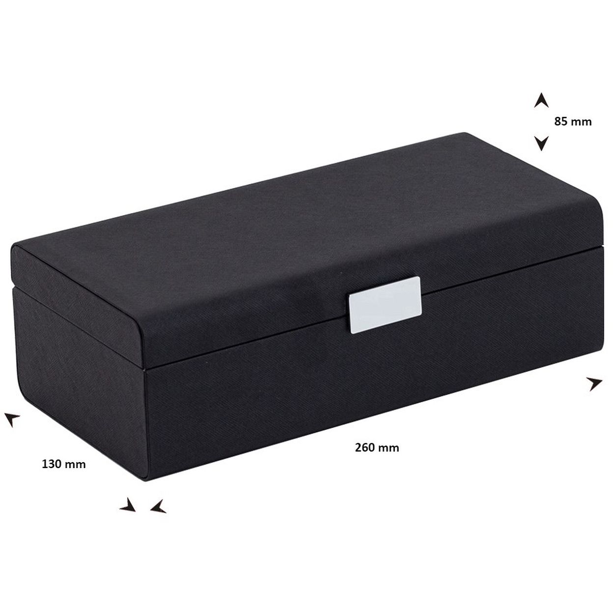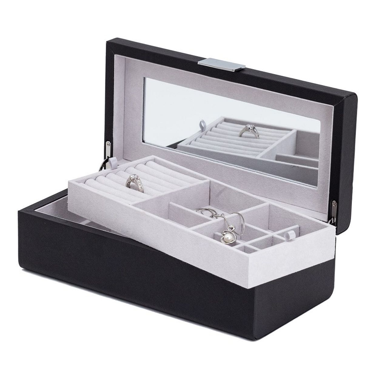 Luxe sieradenbox in de kleur zwart uitgevoerd met stevige scharnieren, magnetische sluiting en een klein spiegeltje. De doos heeft een uitneembaar vak met vakjes in verschillende groottes. Een compacte box om verschillende sieraden in op te bergen.