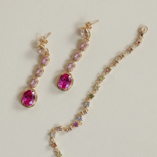 Deze prachtige statement oorbel is voorzien van roze steentjes en is een echte eyecatcher. De oorbel heeft een bijpassende ring en is perfect om met elkaar te combineren. Elk 24Kae sieraad is met liefde en oog voor detail ontworpen door Kae Sutherland. Elke 24Kae-oorbel heeft het authentieke kenmerk van een 24Kae-gravure.