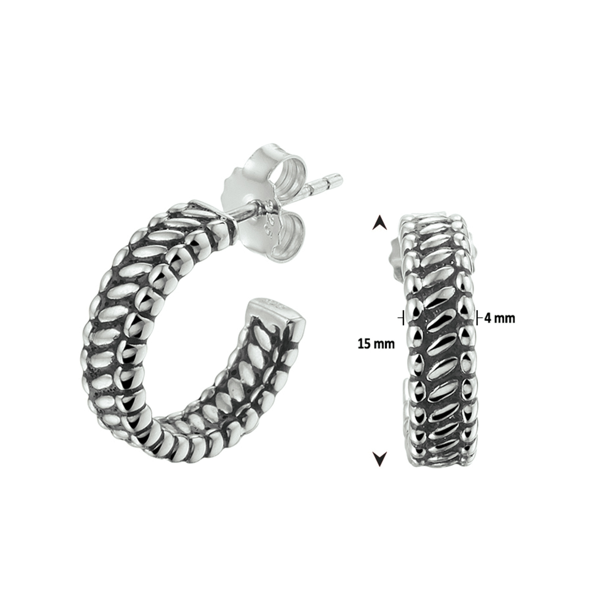 Trendy zilver geoxideerde stekeroorringen uitgevoerd met een stevige poussette sluiting. De stekeroorringen hebben een diameter van 15mm en een breedte van 4mm. Tip: Leuk om kado te geven!