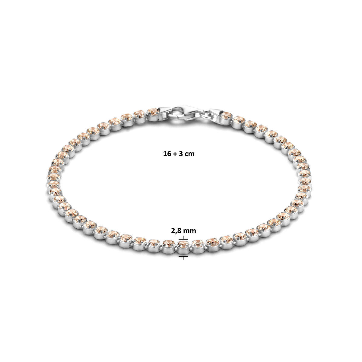 Gerhodineerd 925 zilveren tennisarmband met champagne zirkonia. De armband heeft een draaglengte van 16cm en een extensie van 3cm. Uitgevoerd met een karabijn sluiting.