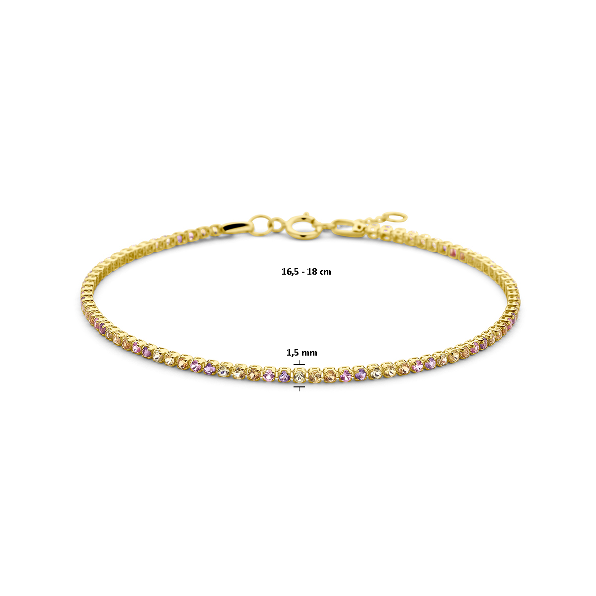 14k Geelgouden tennisarmband uitgevoerd met natuurlijke kleurstenen zoals: amethist, citrien, peridot, roze en geel saffier. De armband heeft draaglengtes van 16.5 en 18cm. De schakelbreedte is 1.5mm.