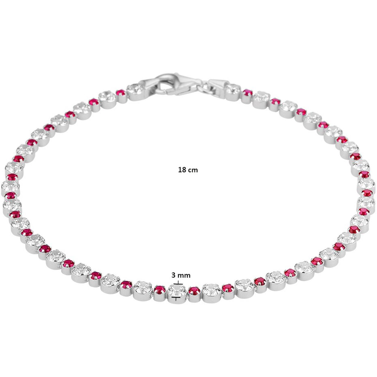 Gerhodineerd 925 zilveren tennisarmband uitgevoerd met transparante en rode zirkonia. De armband heeft een draaglengte van 18cm, een breedte van 3mm en is uitgevoerd met een stevige karabijn sluiting.