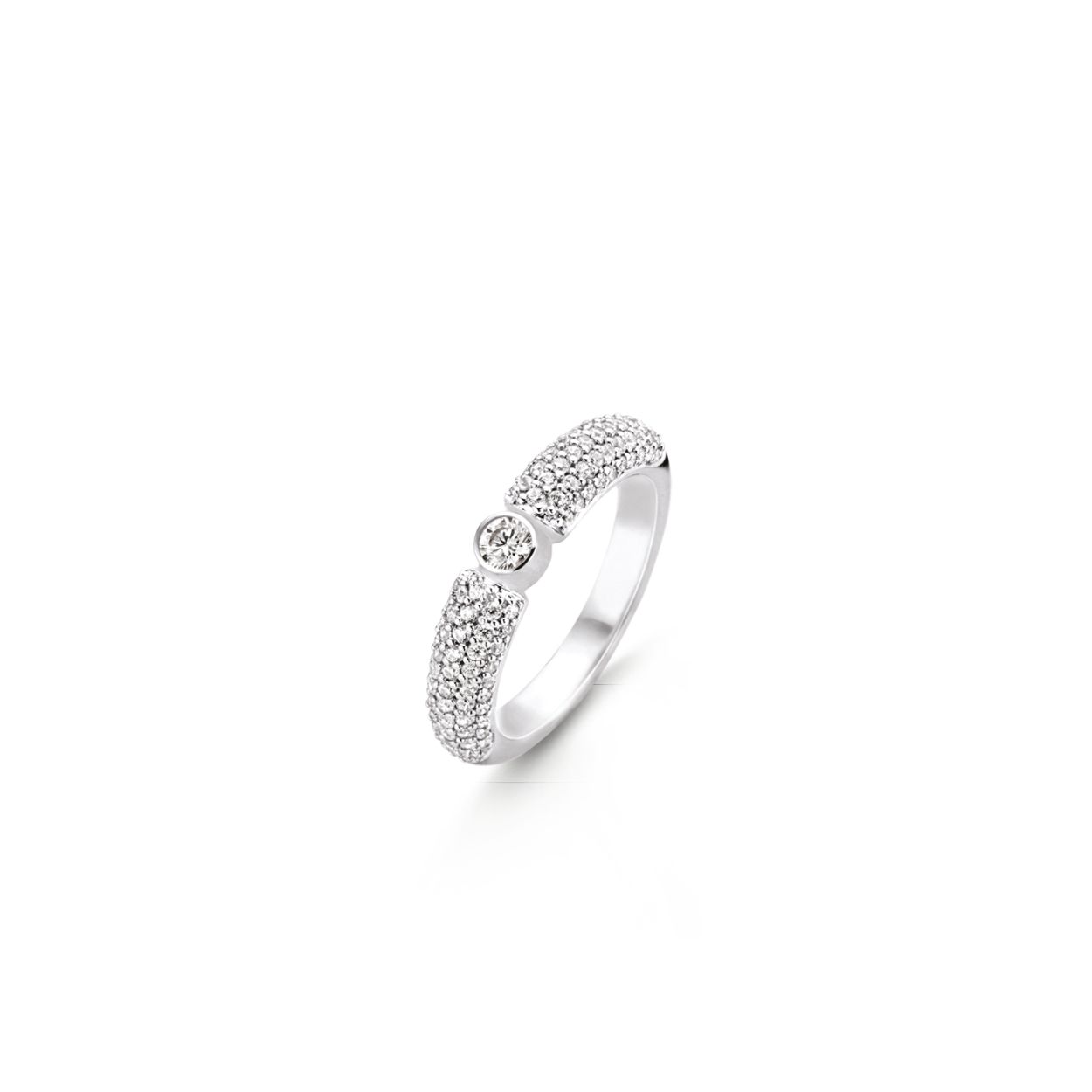 Deze zilveren solitair TI SENTO - Milano�ring 12166ZI met haar scheen van witte zirkonia pav� omarmt zachtjes haar briljant geslepen zirkonia middenstuk. Het is lastig om je blik van haar af te wenden.