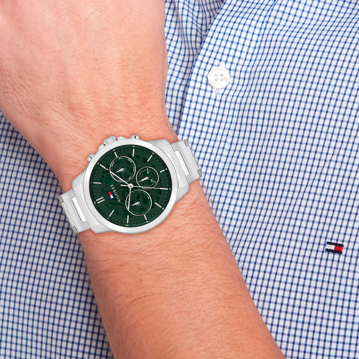 Dit specifieke horloge van Tommy Hilfiger uit de Henry serie met artikelnr: TH1710686 is een stoer herenhorloge die niet in je collectie mag ontbreken. Het herenhorloge heeft een ronde stalen kast met een groene opengewerkte wijzerplaat met een dag, datum en 24-uursaanduiding. Aan de kast zit een stalen schakelband met een vouwsluiting. Het horloge heeft een mineraalglas, een afmeting van 43mm en is 5ATM.