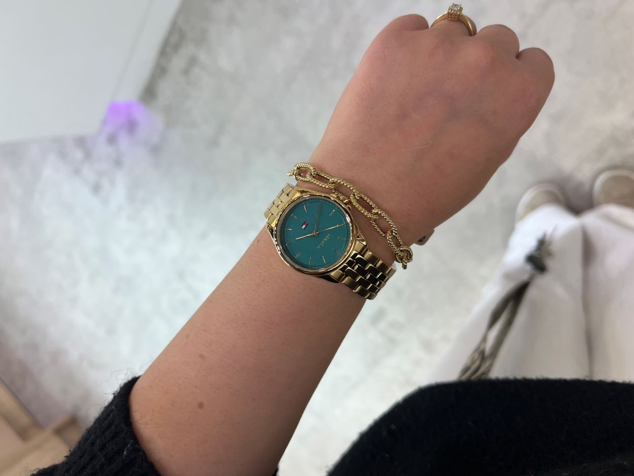 Dit specifieke horloge van Tommy Hilfiger uit de Jade serie met artikelnr: TH1782774 is een luxe dameshorloge die niet in je collectie mag ontbreken. Het stalen dameshorloge heeft een ronde goudkleurige kast met een gladde bezel en een groene emaille wijzerplaat met fijne wijzers en het Tommy logo. Aan de kast zit een goudkleurige glanzende schakelband met vouwsluiting. Het horloge heeft een mineraalglas, een afmeting van 30mm en is 3ATM.