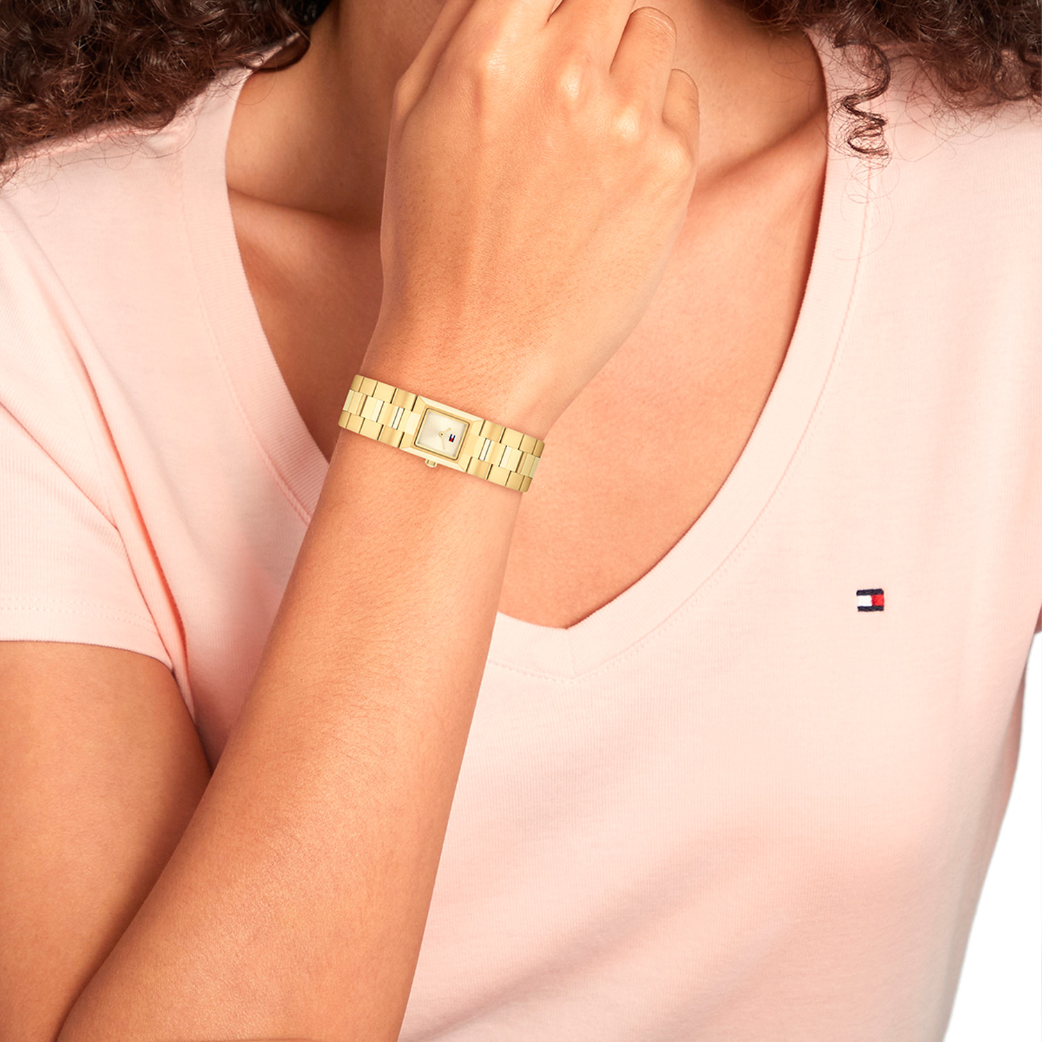 Dit specifieke horloge van Tommy Hilfiger uit de Ivy serie met artikelnr: TH1782787 is een luxe dameshorloge die niet in je collectie mag ontbreken. Het stalen dameshorloge heeft een rechthoekige goudkleurige kast met een glanzende bezel en een goudkleurige sunray wijzerplaat met fijne wijzers en het Tommy logo. Aan de kast zit een goudkleurige glanzende schakelband met vouwsluiting. Het horloge heeft een mineraalglas, een afmeting van 20x25mm en is 3ATM.