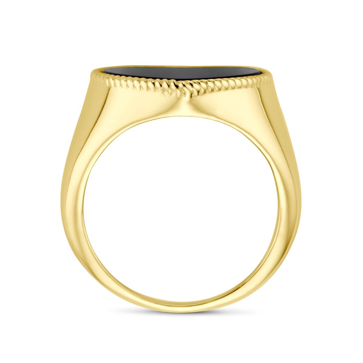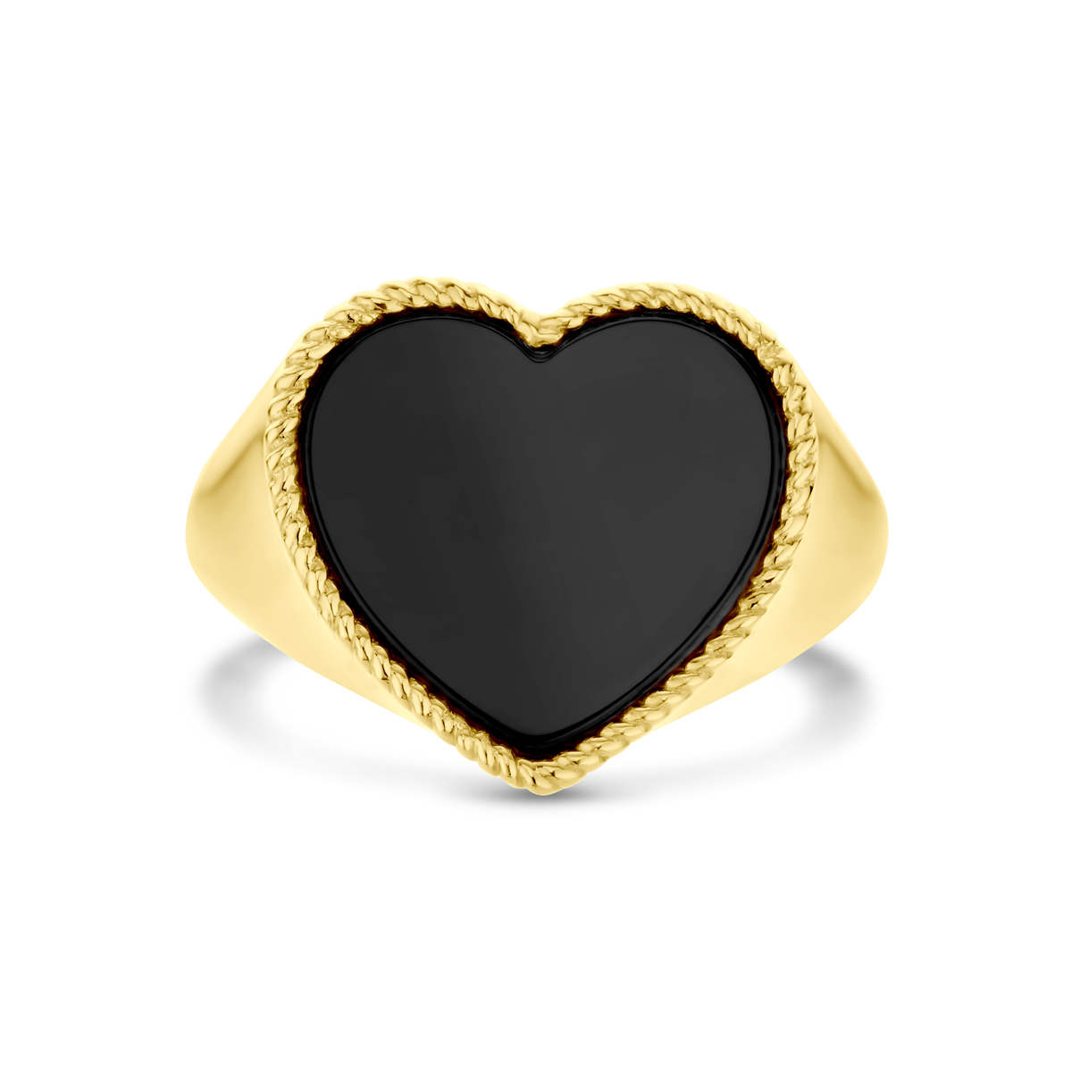 14lk Geelgouden zegelring uitgevoerd in de vorm van een hart met onyx. De ring heeft een breedte van 15.5mm.