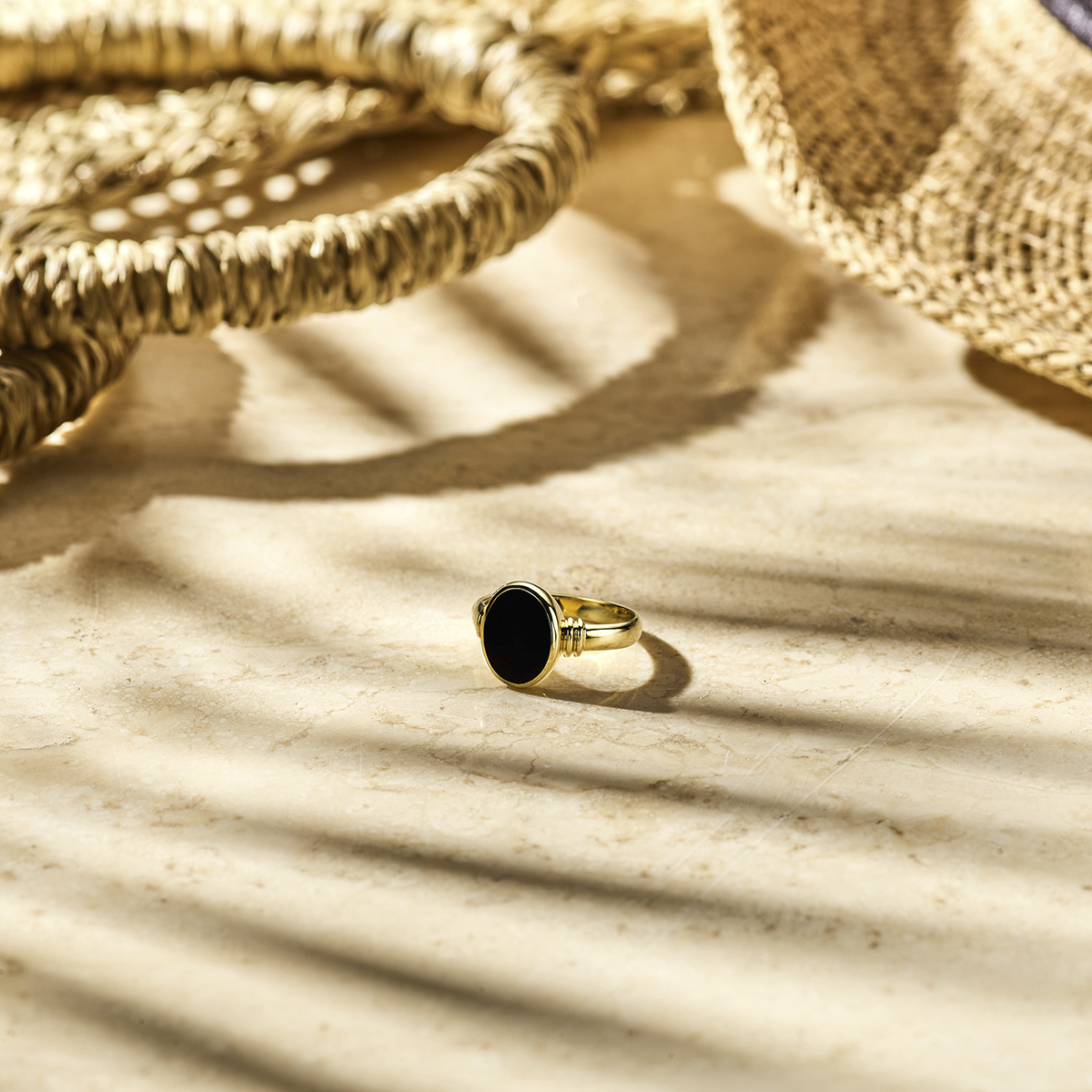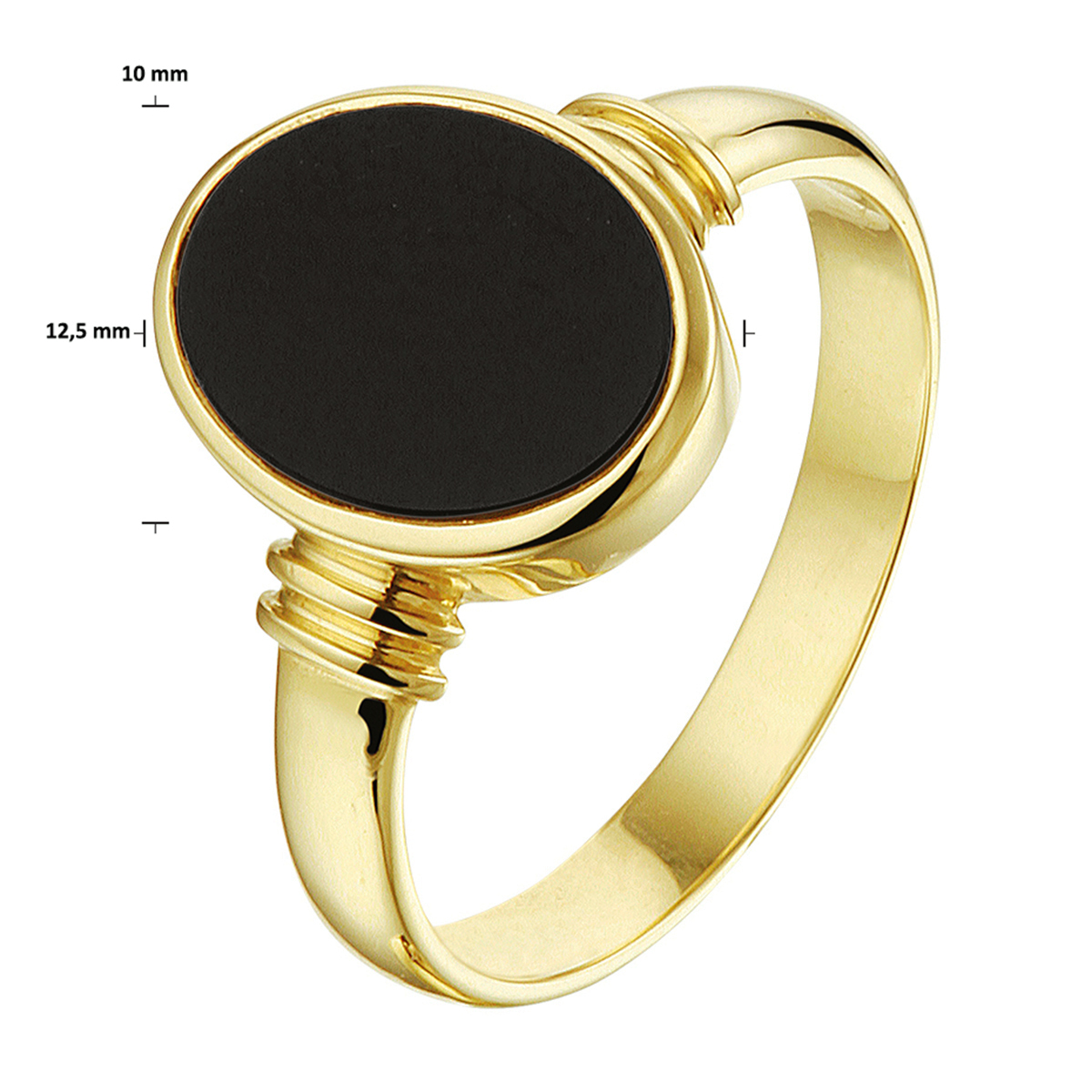 De ring is gemaakt van geelgoud en is zwartkleurig. Het is een sieraad voor dames.