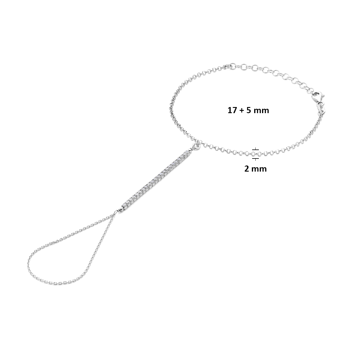 Gerhodineerd 925 zilveren handsieraad met een schakelbreedte van 2mm. Het handsieraad heeft een draaglengte van 17+5cm. Uitgevoerd met zirkonia en karabijnsluiting.